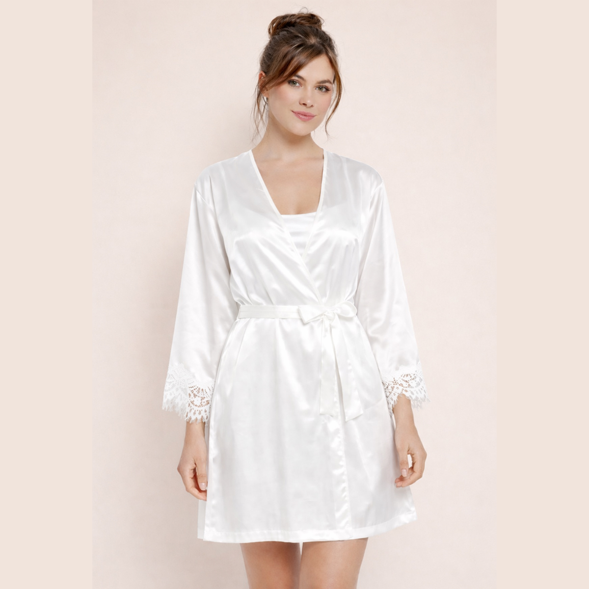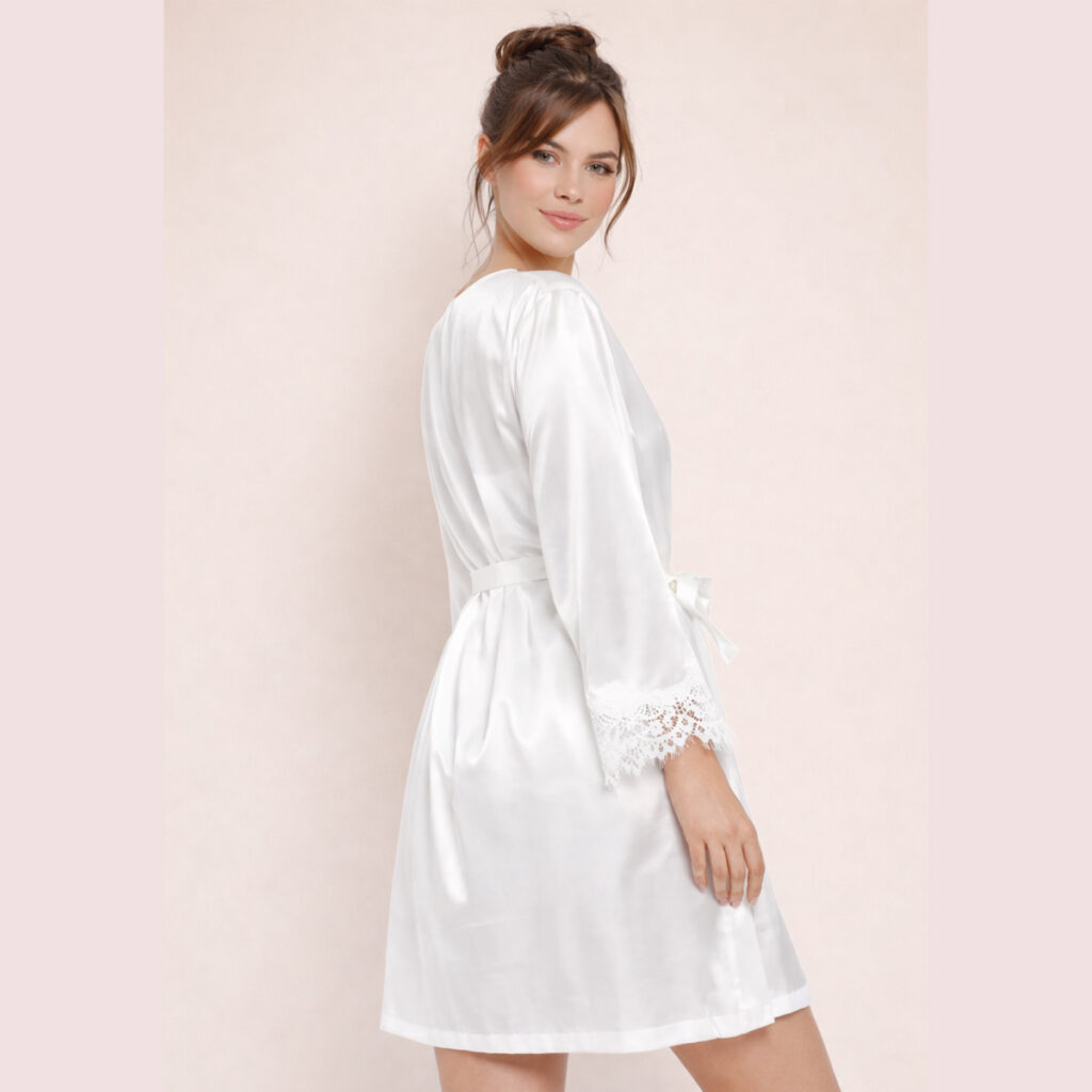 ♥ Η νυφική ρόμπα είναι φτιαγμένη από πολυτελές σατέν soft touch και δαντέλα στο τελείωμα, με απαλή υφή και διακριτική λάμψη.