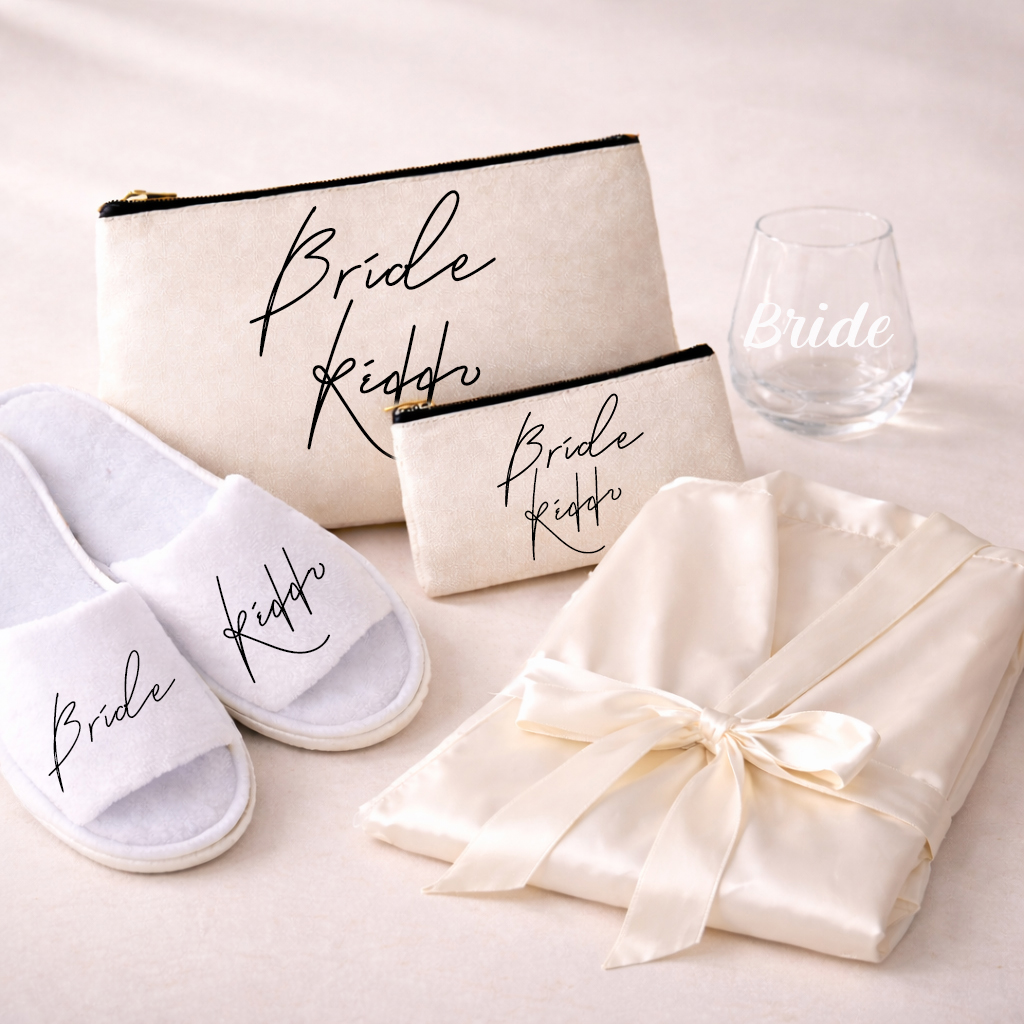 ♥ Το νυφικό σετ προετοιμασίας Bride Fonts 1 συνδυάζει άνεση, αισθητική και πρακτικότητα στις στιγμές πριν τον γάμο.